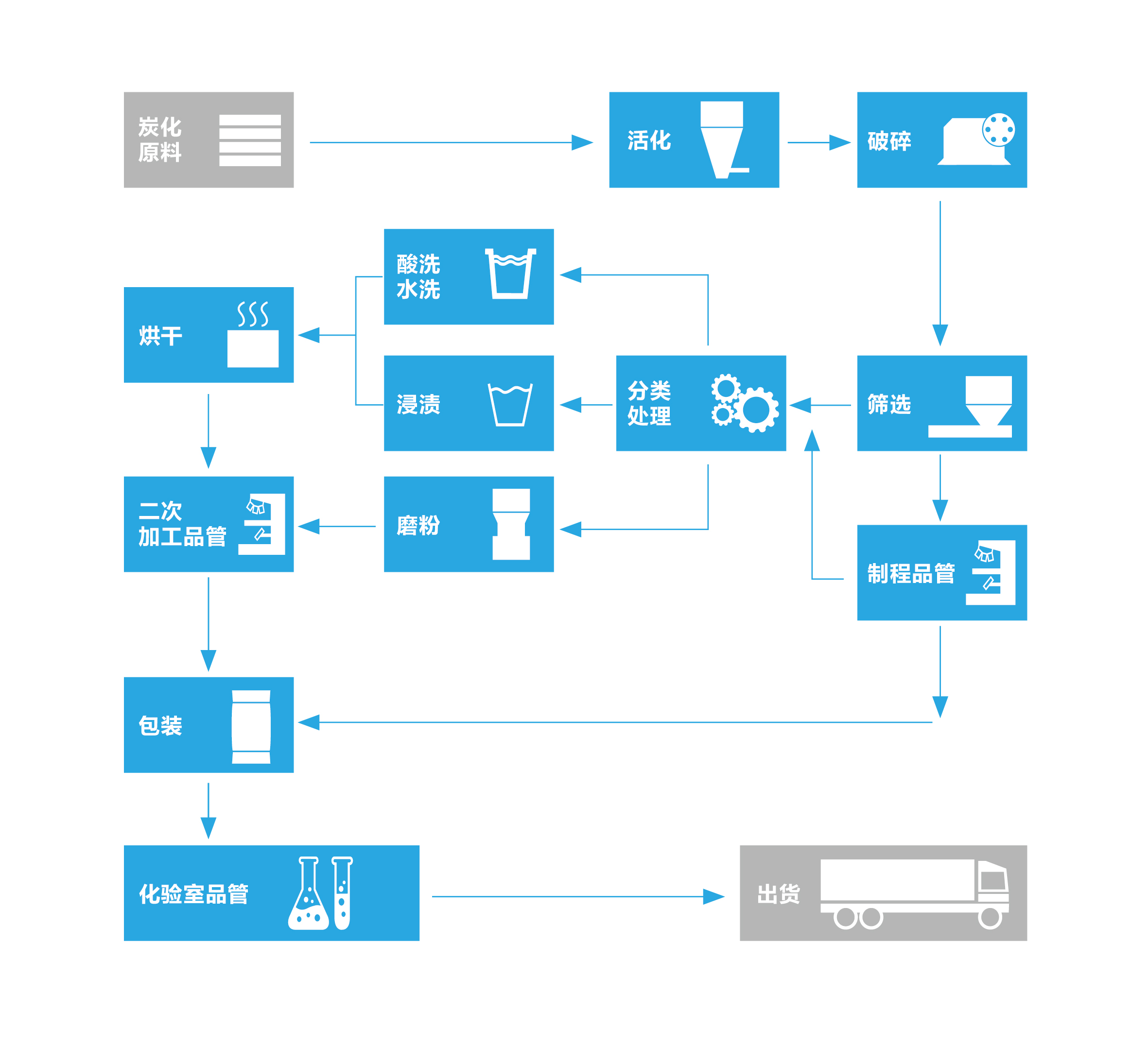 活性炭生產(chǎn)方法有兩種,化學(xué)活化法和物理活化法。 化學(xué)活化法就是通過將各種含碳原料與化學(xué)藥品均勻地混合后,一定溫度下,經(jīng)歷炭化、活化、回收化學(xué)藥品、漂洗、烘干等過程制備活性炭。 物理法通常又稱氣體活化法,是將已炭化處理的原料在800 ~1000℃的高溫下與水蒸氣,煙道氣(水蒸氣、CO2、N2等的混合氣)、CO或空氣等活化氣體接觸,從而進(jìn)行活化反應(yīng)的過程。